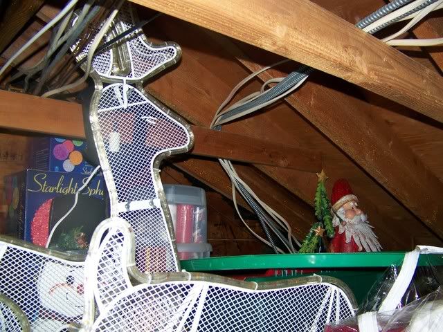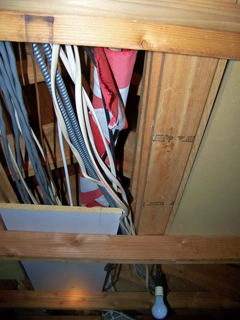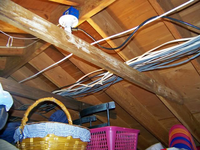 Three photos show cables supported on roof collar (aka rafter) ties. Storage, etc. This is an attic that is also floored and used for storage. This attic is in a garage - load center is on the outside wall and the cables went though the attic to get to the attached home. I'm guessing there are numerous problems (especially the collar ties are also used to store other items.