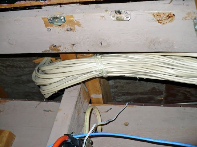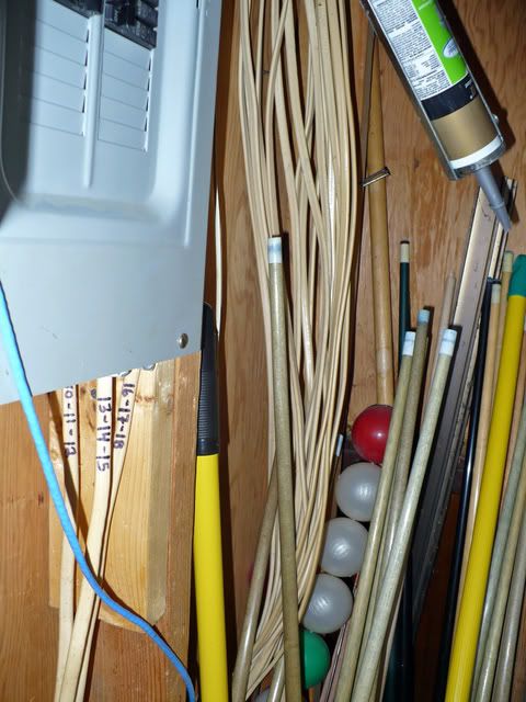 The 2nd photo is in the same place - can get a good photo because of storage in front of the breaker box (another problem). My concern is with the wires in the background - again, physical damage concerns (note the pool cues) and lack of proper support.